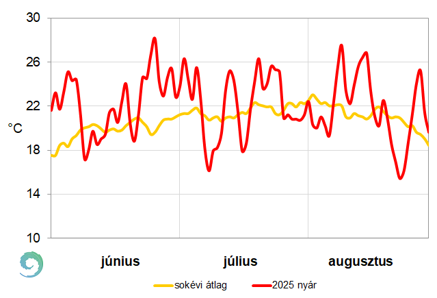 A nyár a szokásosnál melegebb idővel indult, az enyhülésre egészen 8-áig kellett várni. Ezt követően a napi középhőmérséklet egy hétig a sokévi átlag alatt alakult. A folytatásban gyakori frontátvonulások tették változatossá a júniusi időjárást. Június 21-től a Kárpát-medence anticiklonális hatás alá került, és intenzív melegedés kezdődött. Június 23-án egy hidegfront okozott némi megtorpanást, de a hőmérséklet ezt követően tovább emelkedett, és 26-án 28,1 °C-ot mértünk, ami 8,5 fokkal haladta meg az ilyenkor szokásos értéket – ez lett a nyár legmelegebb napja. Július első hetében is folytatódott a hőség. Az enyhülést július 7-én a Gabriel névre keresztelt ciklon hidegfrontja hozta meg, amely több napon keresztül hatással volt térségünk időjárására. Július 16-án egy újabb ciklon hidegfrontja érte el a Kárpát-medencét, és a következő két napban a megszokottnál 2–3 fokkal enyhébb időt okozott. Július 21–24. között átmenetileg anticiklon alakította az időjárást, ekkor az országos középhőmérséklet meghaladta az 1991–2020-as normált, 24–26. között pedig ismét kiadták a harmadfokú hőségriasztást. Ezt követően kissé enyhébb, változékony időjárás vette kezdetét, amely kitartott augusztus első hetében. A hónap közepéig többnyire anticiklonális hatások alakították térségünk időjárását, így jobbára nyugodt, napsütéses idő volt jellemző. Augusztus 17-től két hullámban jelentős lehűlés ment végbe: először az Északkelet-Európa felett örvénylő ciklon hosszan elnyúló hidegfrontja, majd a Lukas névre keresztelt mediterrán ciklon okozott markáns lehűlést. Augusztus 24-én az országos középhőmérséklet mindössze 15,4 °C volt, ami több mint 5 fokkal elmaradt a sokévi átlagtól – ez lett a nyár leghidegebb napja. Ezt követően gyors melegedés kezdődött: augusztus 28–29-én a napi középhőmérsékletek 4–6 fokkal meghaladták a normált. Az évszak zárásaként augusztus 29-én nyugat felől egy hullámzó hidegfront érte el térségünket, amely újabb lehűlést hozott.