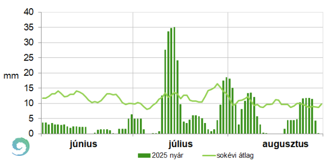 A 10. ábrán bemutatott országos átlagban vett, 5 napos csapadékösszegek a talaj szempontjából mérvadóak. Ezek alapján jól látható, hogy június rendkívül száraznak bizonyult, míg júliusban és augusztusban az 5 napos összegek időnként elérték és olykor jelentősen meghaladták a sokéves átlagot. Júniusban jellemzően száraz időjárás uralkodott, bár néhány hidegfront mentén záporok és zivatarok alakultak ki, ezek azonban csak helyenként okoztak számottevő csapadékot. A hónap legcsapadékosabb napján – június 26-án – is mindössze 3,4 mm esett országos átlagban. Július első hetében folytatódott a szárazság, majd a hónap további részét változatosabb csapadékviszonyok jellemezték. A Gabriel ciklon érkezésével több hullámban vonultak át az ország felett kiterjedt csapadékrendszerek, zivatarokkal, viharos, helyenként orkánerejű széllökésekkel. Kelet-Magyarországon egy szupercella is kialakult, amelyhez szintén orkánerejű széllökések társultak. A hónap közepén szórványosan fordultak elő záporok és zivatarok. Július 24-től egy hullámzó frontálzóna okozott csapadékos időt, majd 27-től egy ciklon mélyült ki térségünkben, így több helyen eső, zápor és zivatar alakult ki, utóbbiakat helyenként felhőszakadás is kísérte. A Somogy vármegyei Csökölyön 184,0 mm-es napi csapadékösszeget mértek, ami rendkívüli érték: a HungaroMet Nonprofit Zrt. adatbázisában ez az ötödik legnagyobb napi csapadékösszeg, egyben a 2025-ös nyár legmagasabb értéke.