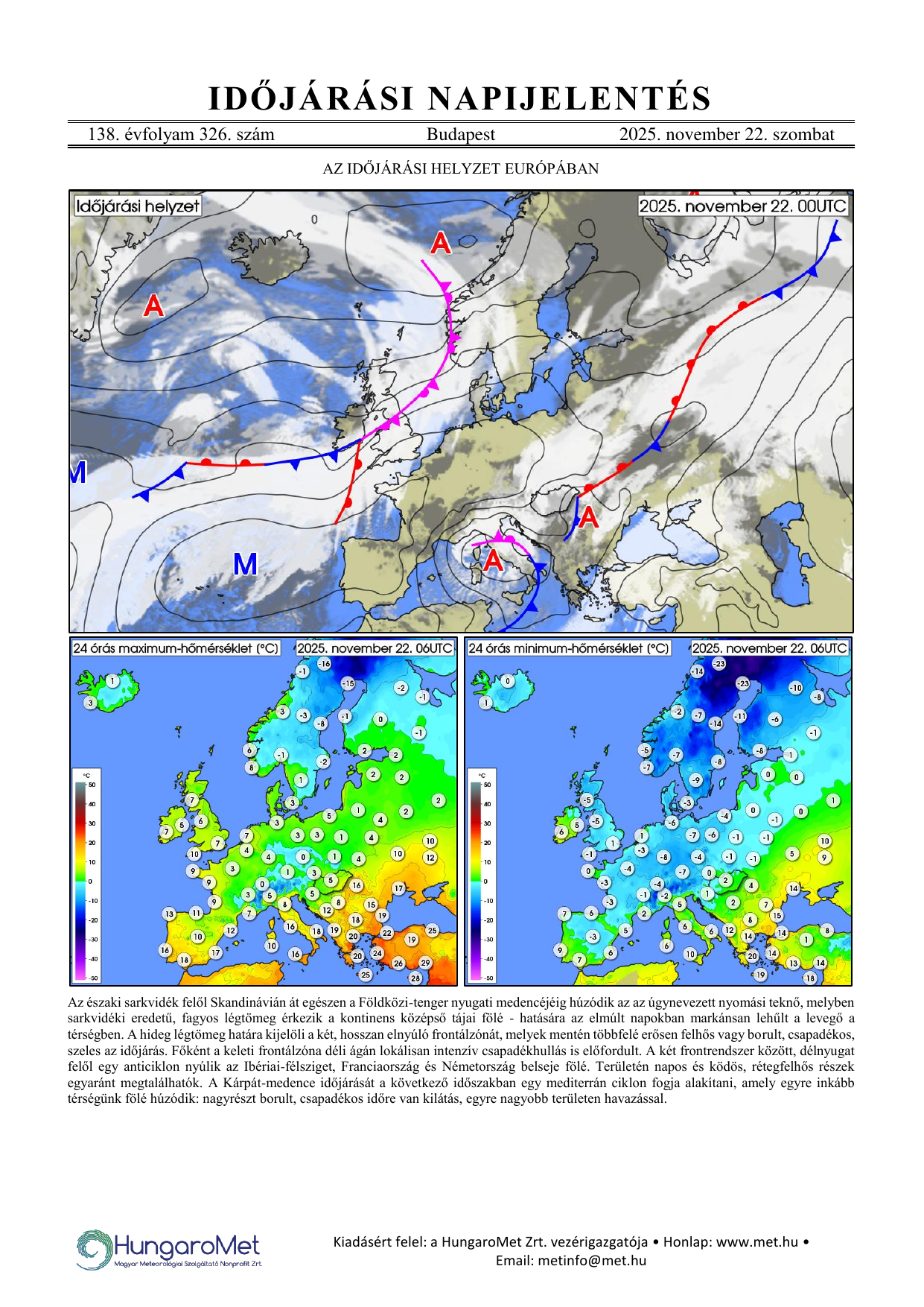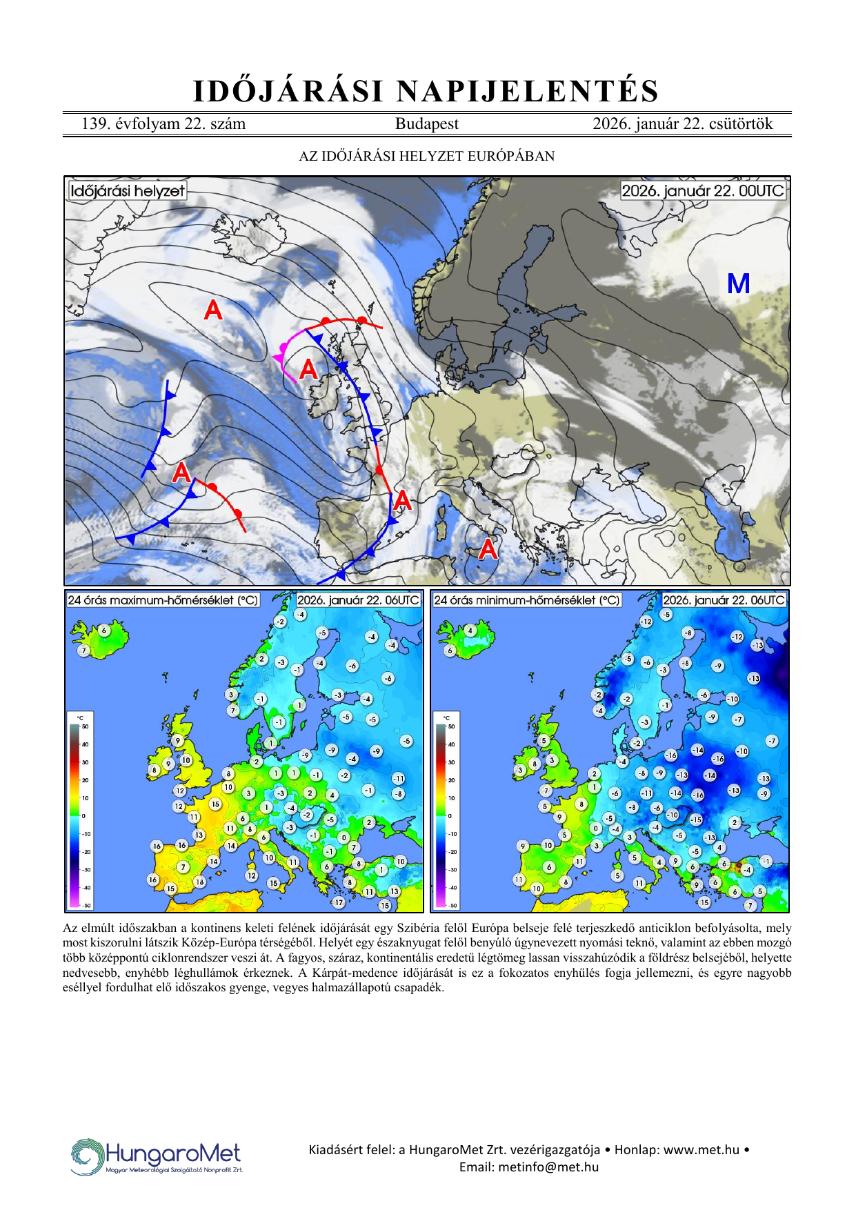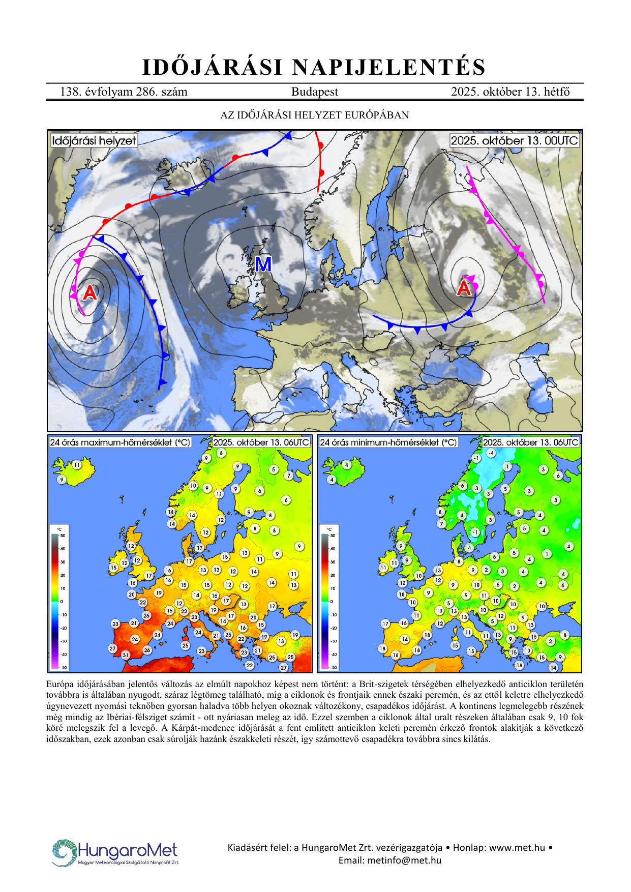 Az európai kitekintés a fronttérkép és a rövid szöveges elemzés mellett bővül a hőmérséklet napi minimum- és maximumértékeit ábrázoló térképekkel.