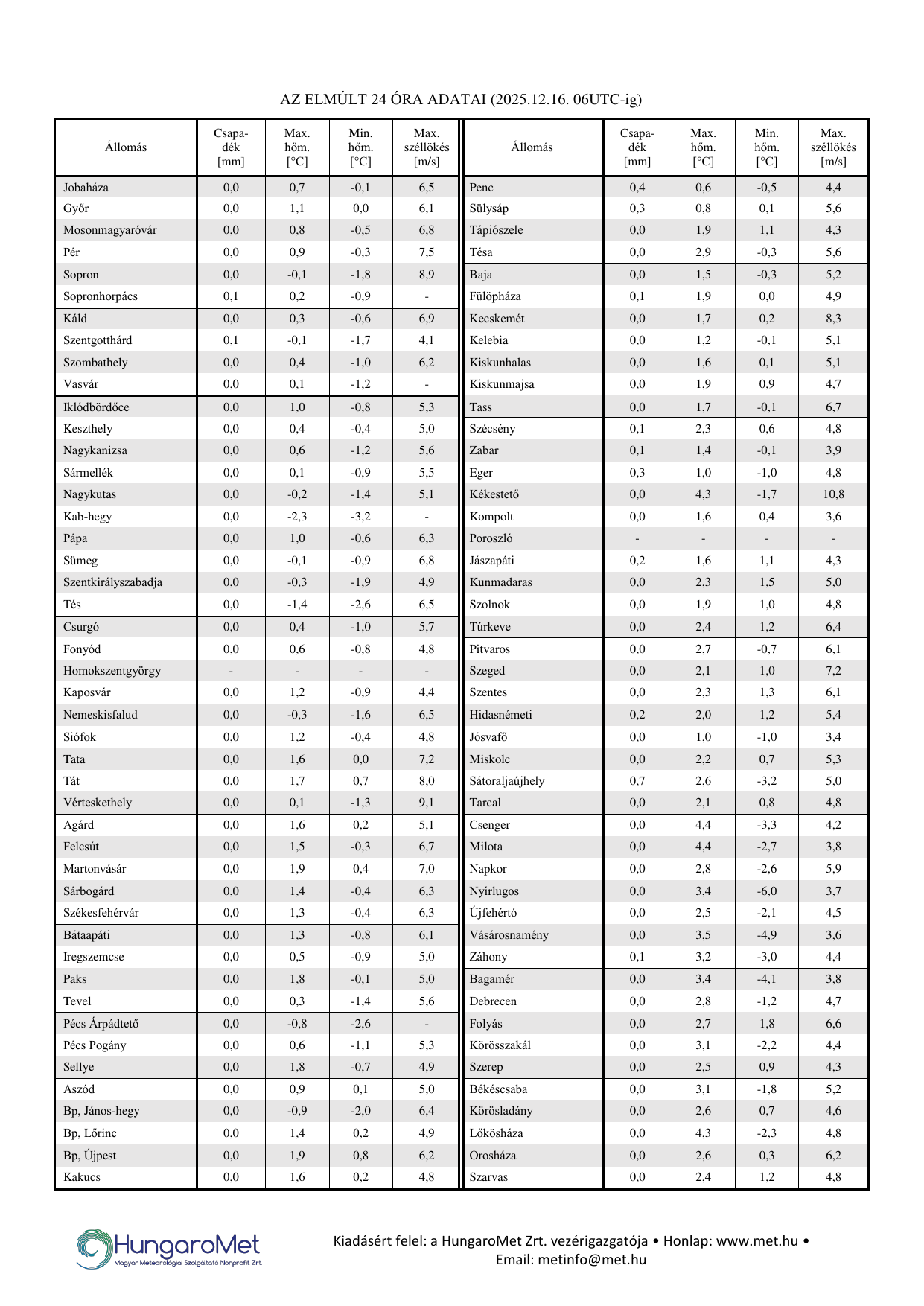 A meteorológiai elemek OMSZ által mért napi értékei ezentúl kontúrtérképeken jelennek meg, de továbbra is tartalmaznak konkrét számértékeket, a korábbinál jóval több állomásról. A térképek alatt táblázatos formában feltüntetjük a napi szélsőértékeket és az abszolút napi rekordadatokat. Az eddigiektől eltérően a napi (24 órás) adatok egységesen, 06 és 06 UTC közötti időszakot fednek le – nagyobb összhangban a nemzetközi gyakorlattal.